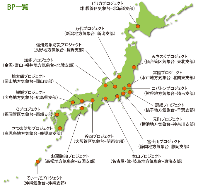 防災プロジェクト(BP)は、局地的な大雨等による被害の軽減の取り組みとして、当会が気象庁と業務委託契約を結び、連携して全国各地で行われています。
